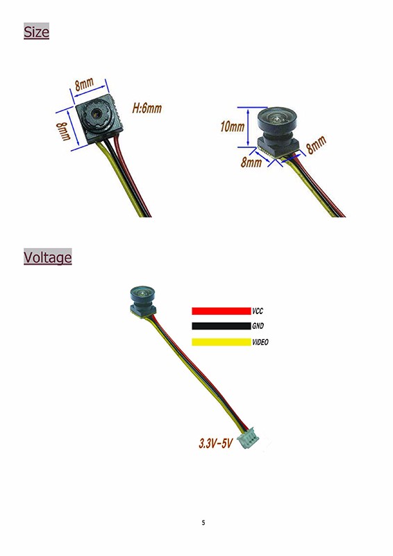 | Image Sensor: 1 / 3″ CMOS System:PAL/NTSC Horizontal Resolution: HD 800TVL Minimum Illumination: 0.1 Lux S / N Ration: > 48db Operating Temperature: – 40 ~ + 85 Centigrade Power Consumption: DC 5.5V ~ 12V White Balance: Auto Video Output: 1 vp – p 75 Ω; Negative Synchronizing System: Interior Synchronization Size:8mm*8mm Image Color: Color |